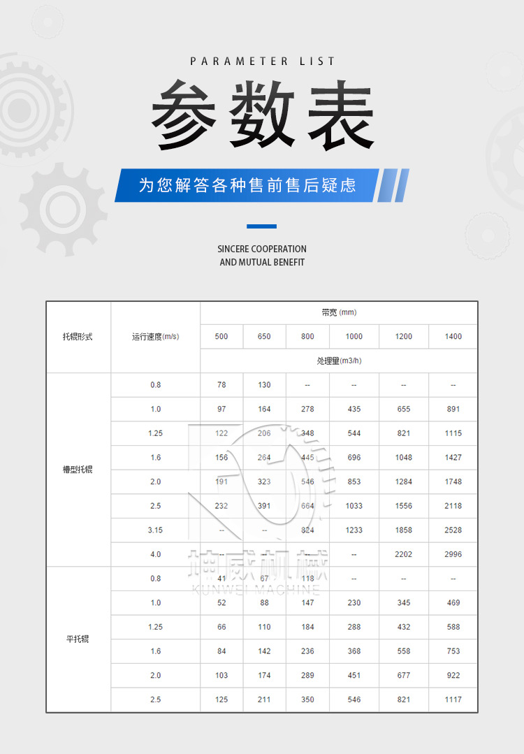 定貨時需注明:帶速、帶寬、輸送距離、輸送量、傾斜角度、物料特性、工作環境、堆積角度、皮帶材料等技術參數。